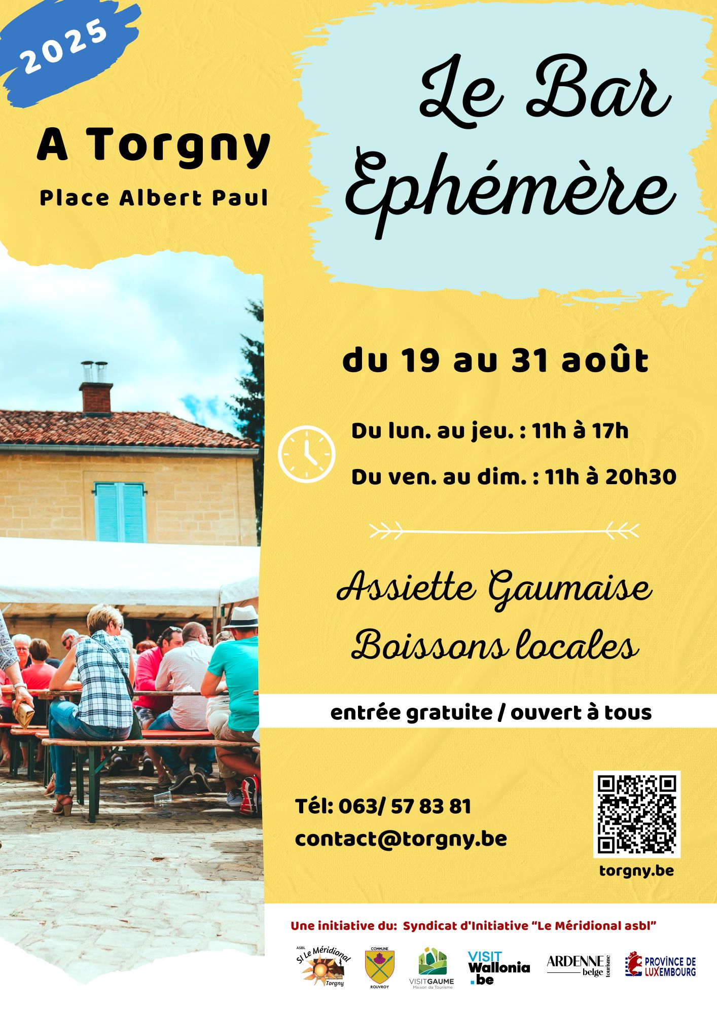 Le Bar Ephémère au mois d’août, alors que le seul restaurant du village ferme ses portes pendant ses congés annuels. Nos bénévoles reçoivent chaleureusement les visiteurs dans une ambiance conviviale. Le bar éphémère est aménagé sur la Place de Torgny. Des plats et des boissons locaux y sont proposés.