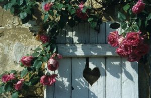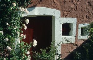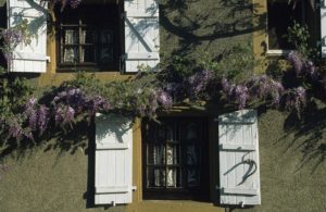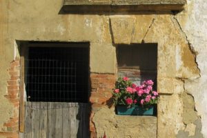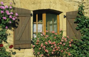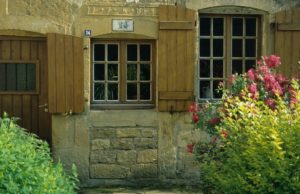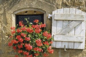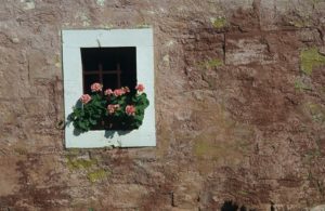 Torgny : charmante fenêtre fleurie sous un soleil printanier rue Grande (photo juin 1997)